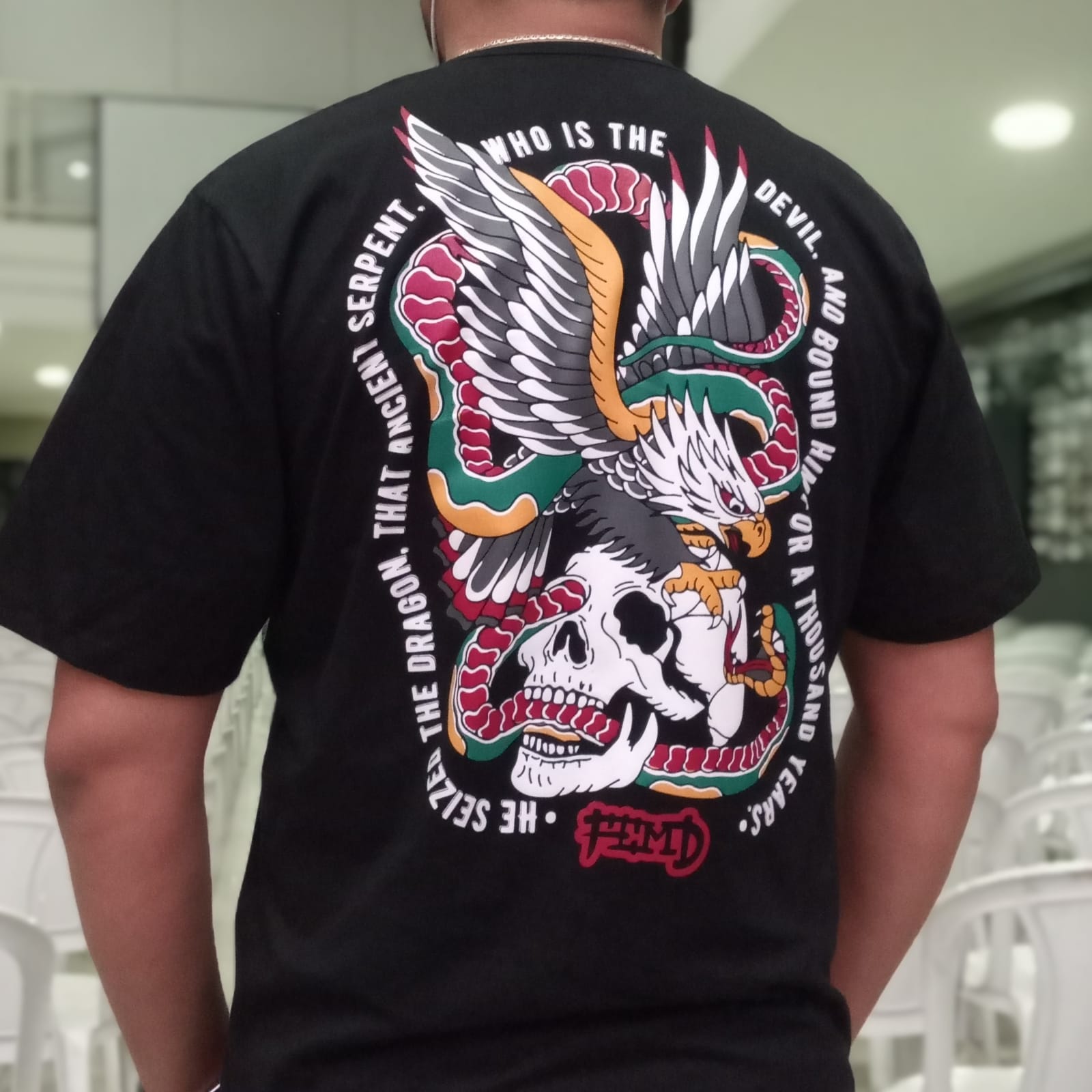 - Esta camiseta tem a inspiração em Apocalipse 20:2, Ele prendeu o dragão, a antiga serpente, que é o Diabo e Satanás, e amarrou-o por mil anos.