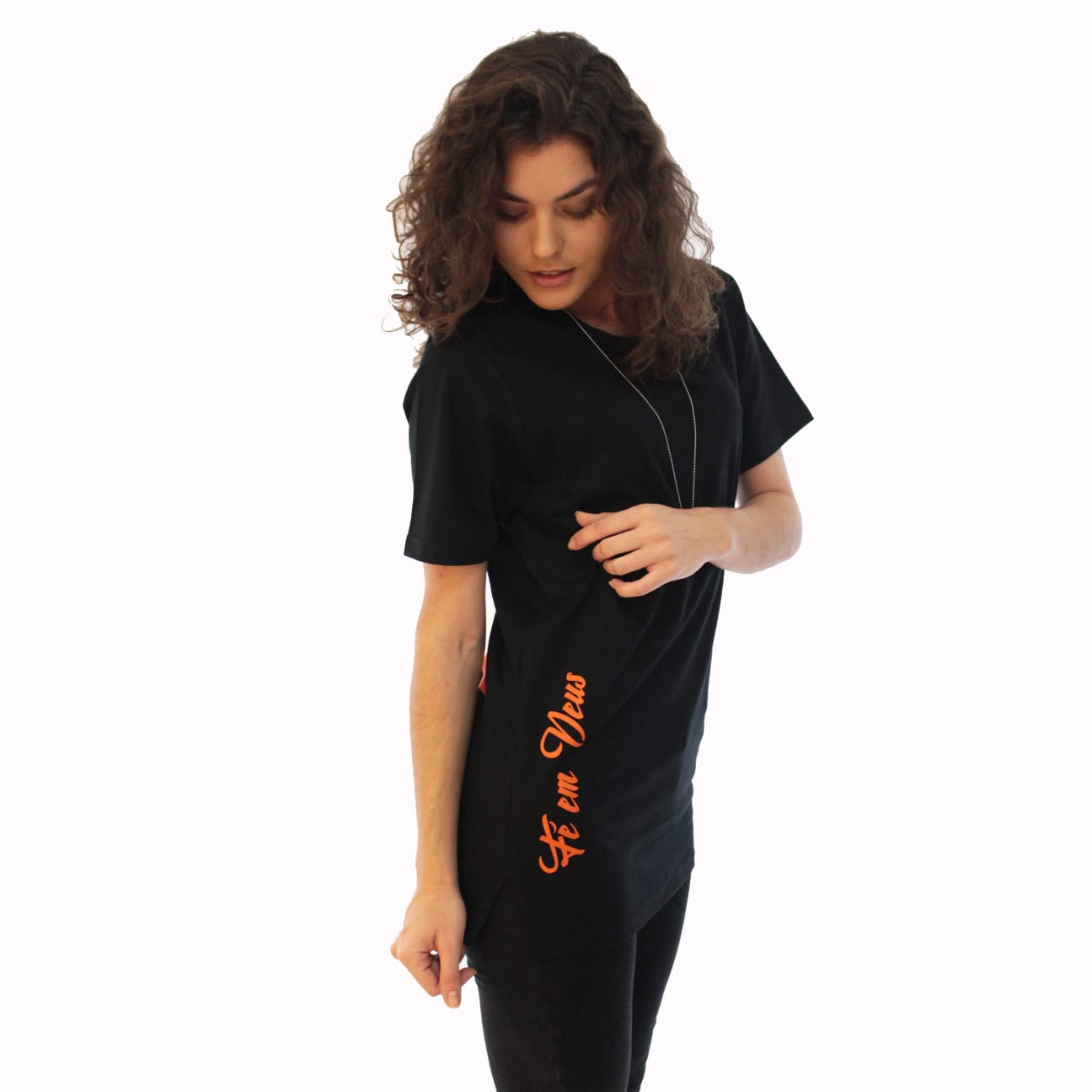 Camiseta estampada com tinta Silk Screen na cor laranja, etiqueta interna em silk, etiqueta externa, sua composição é algodão premium, malha 26.1 que possui conforto e maciez e ao mesmo tempo resistência e durabilidade.