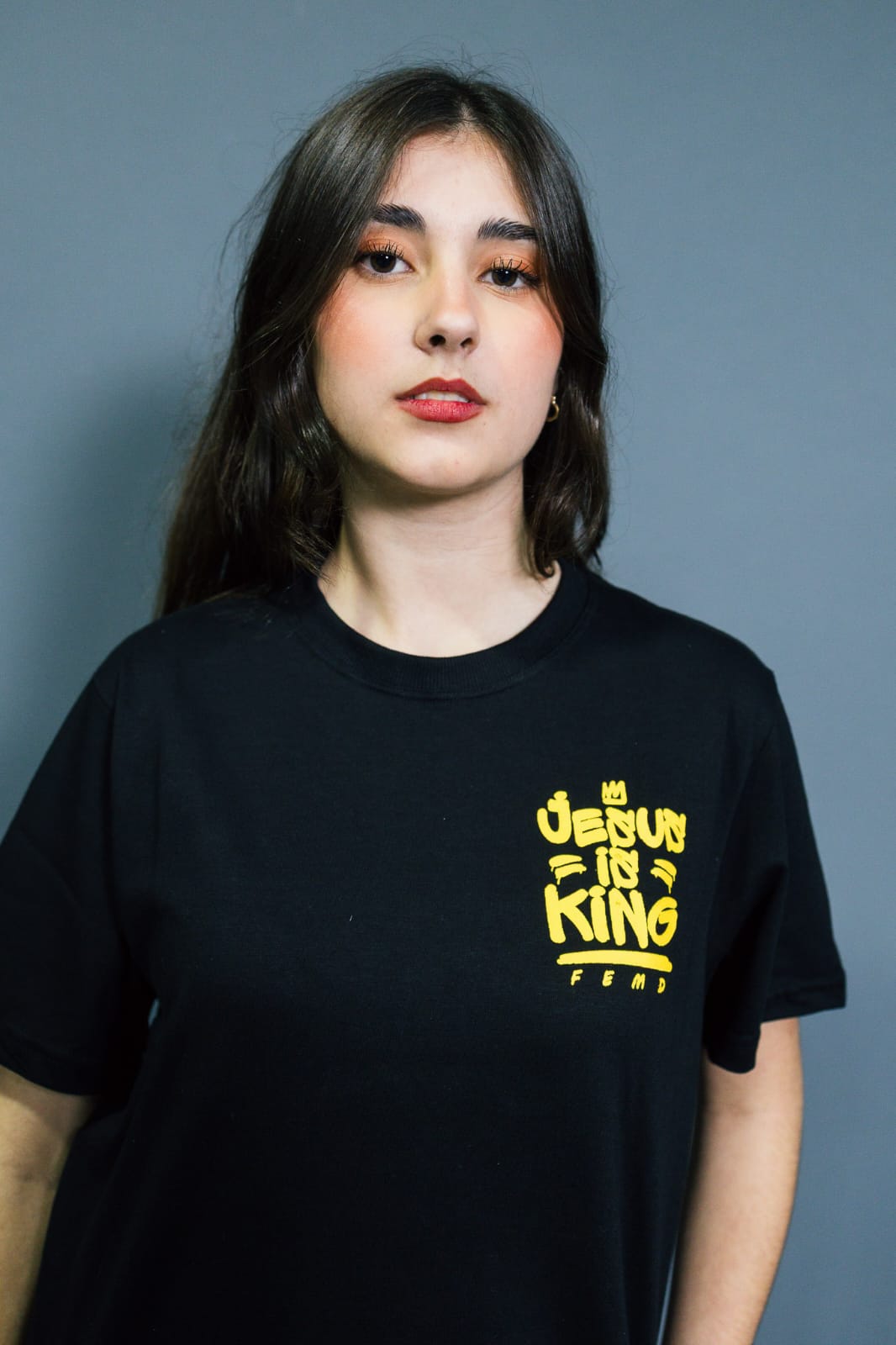 Camiseta Jesus is King, cor Preto com Silk Amarelo.
