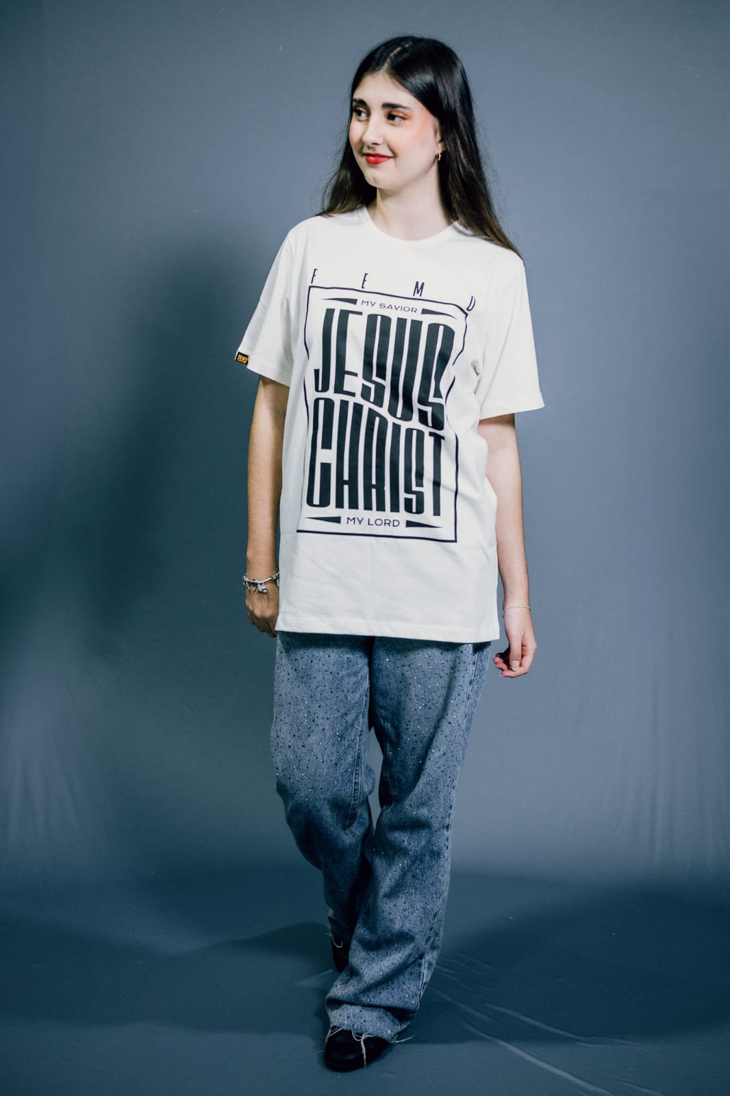 Camiseta MY SAVIOR, Meu Salvador, COR OFF WHITE com Silk frontal na cor preta, etiqueta personalizada na manga.